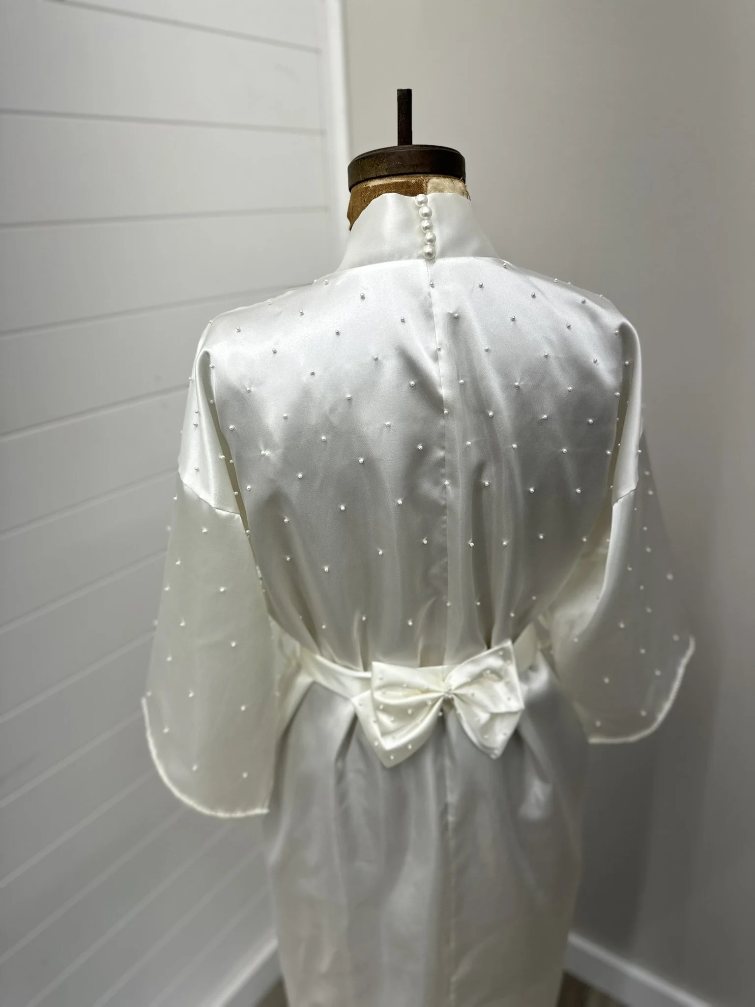 A mom brought in her fairly simple satin gown to turn into a surprise robe for her daughter. It had pearl and lace accents on the bodice and sleeves and a beaded pearl edge that hemmed the entire dress. She shared that she and her fiancé had hand-beaded that together before the wedding, a detail that must have taken dozens of hours. Sadly, her husband had recently passed away, so I really wanted to make sure that detail became a prominent feature of the robe. I spent hours carefully hand sewing those special pearls into an ombré polka dot pattern across the bodice of the robe so that on her wedding morning, the bride would quite literally be wrapped in both her mom and her dad. I am not a cryer, but there were a lot of tears from both of us when she picked up that robe, and I am sure for the bride as well!