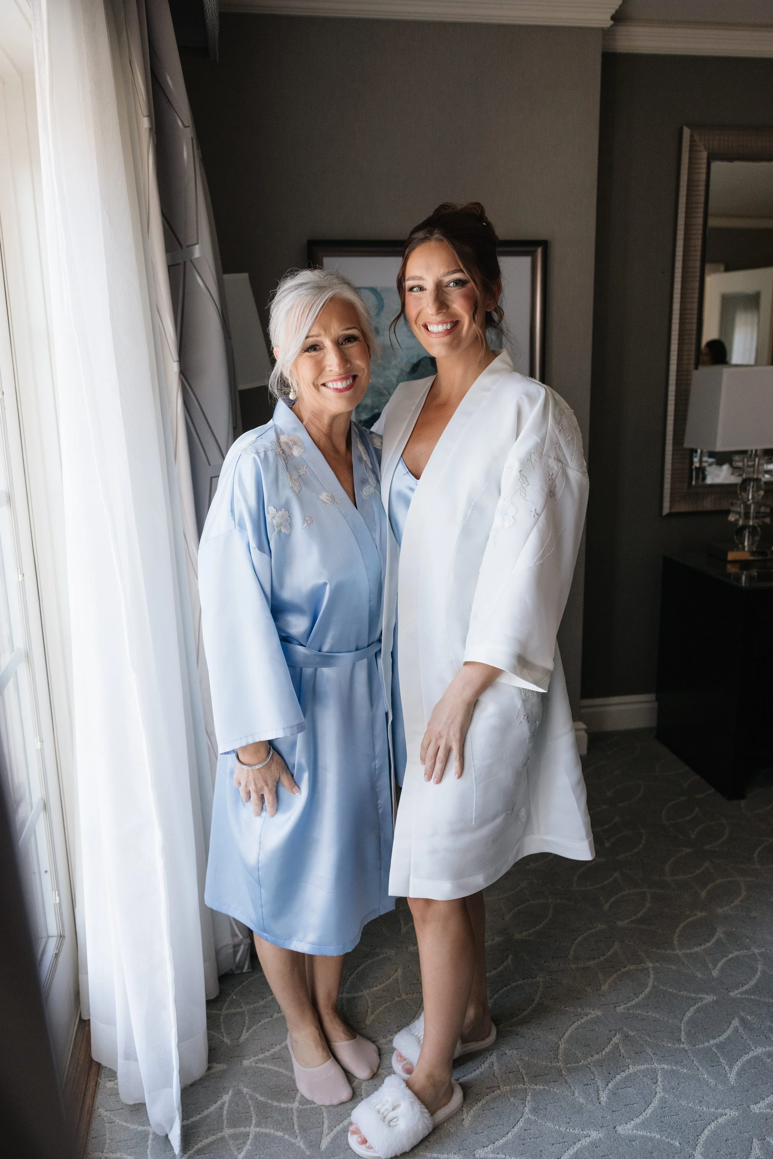 Rachel’s mom, Deniser, brought in her 2002 wedding gown, that she loved so much “I know everybody loves their dress, but I loved my dress”. It was colorful! It had beautiful pink, blue, and green flowers embroidered throughout, something we don’t see very often. For Rachel, we transformed it into a bridal robe made entirely from her mom’s original dress. We also created a matching “mama robe” with a soft blue base and floral appliqué from the gown, along with coordinating blue camisole slip dresses for both of them. They wore these pieces together on the wedding morning while getting ready, and it set the sweetest, most sentimental tone for the entire day.